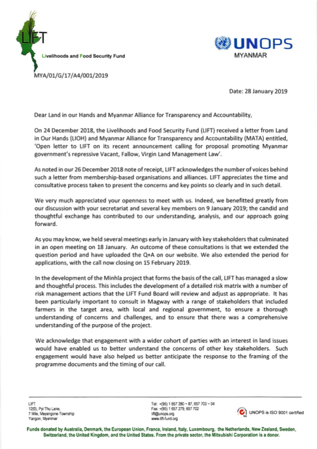 Land in Our Hands (LIOH) and Myanmar Alliance for Transparency & Accountability (MATA) jointly send the open letter to LIFT regarding its recently launched call for proposal “REAL DEV Programme”; in 24 December 2018. LIFT responded to the open letter that it has added safeguards in the development of the project: